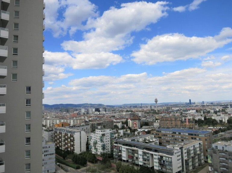 Diese attraktive Wohnung im 17. Stock überzeugt mit modernem Wohnkomfort, einem durchdachten Grundriss und einem beeindruckenden Fernblick über Wien bis zum Kahlenberg. Große, bodentiefe Fenster sorgen für ein helles und freundliches Wohnambiente.