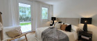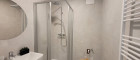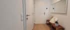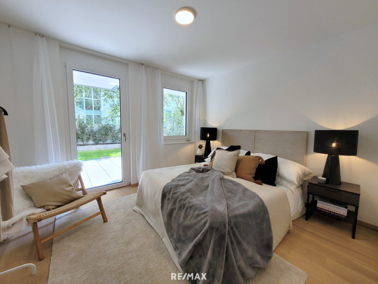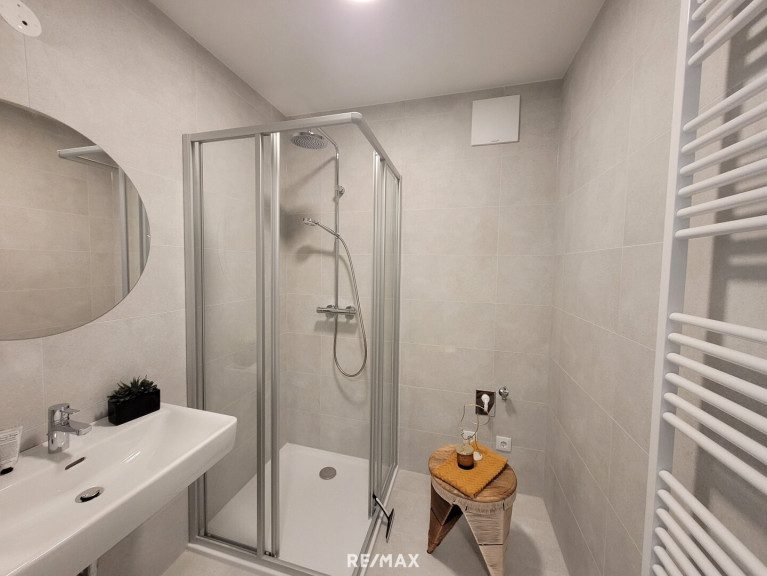 Auch vom Schlafzimmer kann man direkt ins Freie. Das Bad ist mit modernen, eleganten Fliesen (60 x30) ausgelegt und überzeugt neben einer Dusche und einem Waschbecken auch mit einem Handtuchhalterheizkörper und einem Waschmaschinenanschluss. Das WC mit Handwaschbecken ist extra.