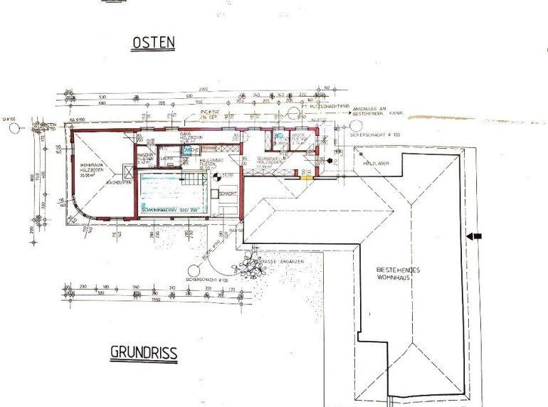 Schrankflur 17,96m², Badezimmer 6,12m², Indorpool plus Sauna und Dusche 33,59m² (Pool 600x350), Gang 11,16m², Wohnraum 36,58m², Technikraum Pool