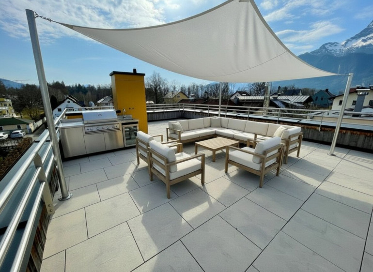 Das großzügige Raumangebot setzt sich im Außenbereich fort: Ein liebevoll gepflegter Garten lädt zum Entspannen und Verweilen ein, während gleich drei Terrassen vielfältige Möglichkeiten bieten, sonnige Stunden im Freien zu genießen – sei es bei einem gemütlichen Frühstück, einem geselligen Abend mit Freunden oder einfach beim Relaxen nach einem langen Tag. Das absolute Highlight ist die XL-Dachterrasse, die mit fast 70m² Fläche und 360 Grad Rundumblick Sie und Ihre Gäste einfach nur Staunen lassen wird. Hier können Partys zum atemberaubenden Erlebnis werden!