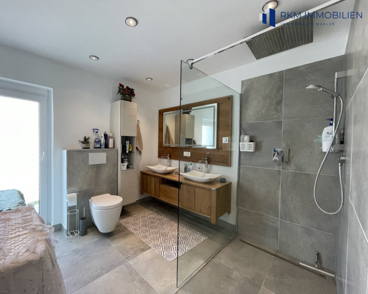 Das Haus ist mit insgesamt drei WCs und drei Bädern ausgestattet – ideal für Familien oder Gäste. Das Badezimmer mit Fenster und Dusche ist besonders einladend und sorgt für ein angenehmes Ambiente.