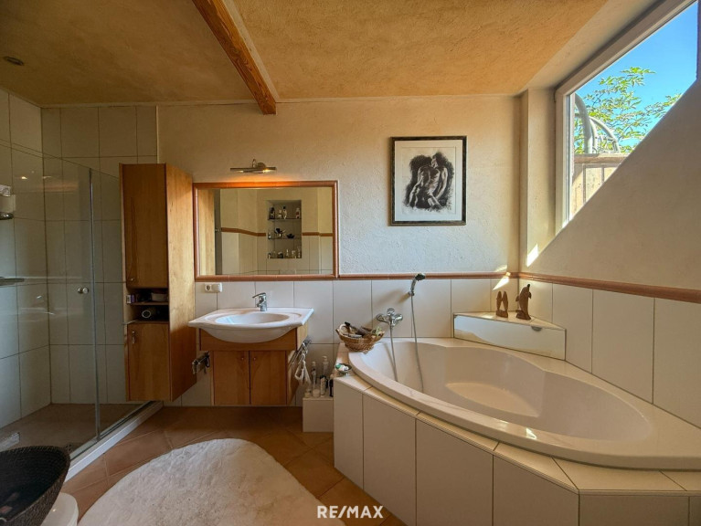 Estrichboden, Fliesen, Laminatboden, Parkett, Zentralheizung, Einbauküche, Bad mit Fenster, Badewanne, Dusche, Carport, Parkplatz, Gastterrasse, Sauna