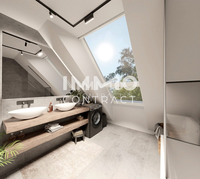 Die Kinder teilen sich ein eigenes Bad mit Badewanne – perfekt für kleine Wasserspiele und entspannte Morgen. Für Eltern gibt es ein separates Bad mit Dusche und eigenem WC, dazu ein praktisches Gäste-WC für Besuch. Ein Abstellraum mit Waschmaschinenanschluss sorgt für Ordnung im Familienchaos.