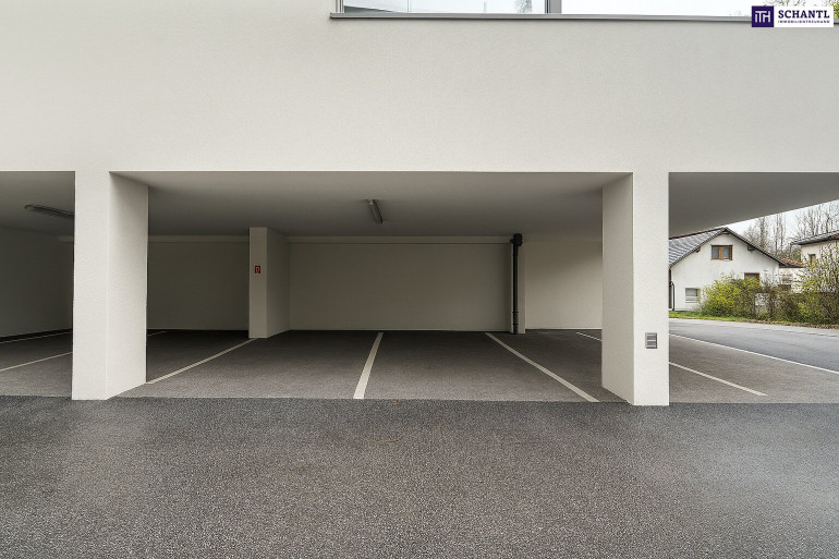 Parkett, Fliesen, Fußbodenheizung, Einbauküche, Wohnküche / offene Küche, Personenaufzug, Südbalkon, Dusche, Carport