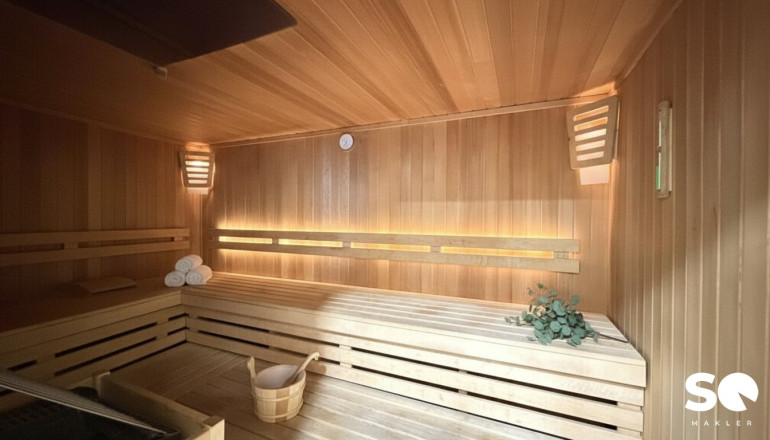 Parkett, Fliesen, Fernwärme, Wohnküche / offene Küche, Personenaufzug, Badewanne, Kabel/Satelliten-TV, Tiefgarage, Sauna