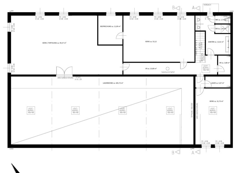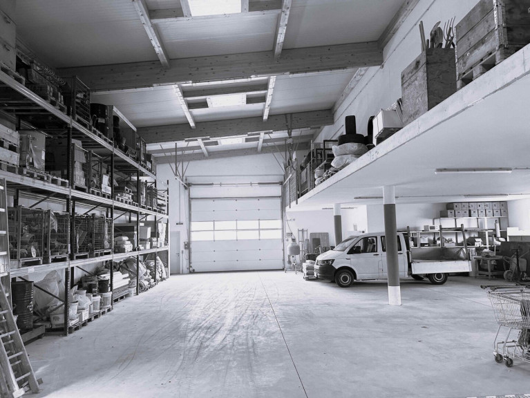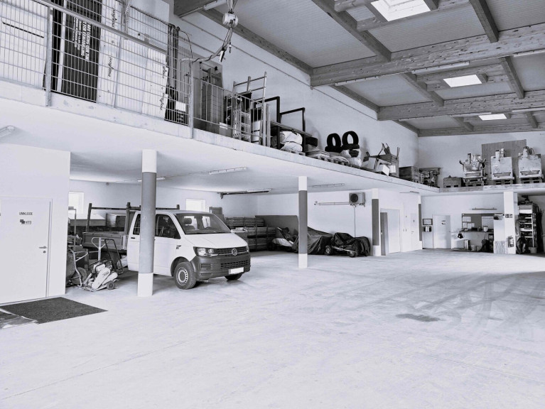 Ebenerdig befinden sich ca. 430 m² Lager- und Sozialflächen. Die direkte Zufahrt erfolgt über zwei Sektionaltore. Die Hallenflächen erstrecken sich teilweise über zwei Ebenen bis ins Obergeschoß, wodurch die Möglichkeit besteht, die Räume im Obergeschoß von der Halle aus über eine Mezzaninfläche mit einem Stapler zu bedienen. Im Obergeschoß befinden sich zudem funktionale 190 m² Büroflächen sowie weitere Sanitärräume.