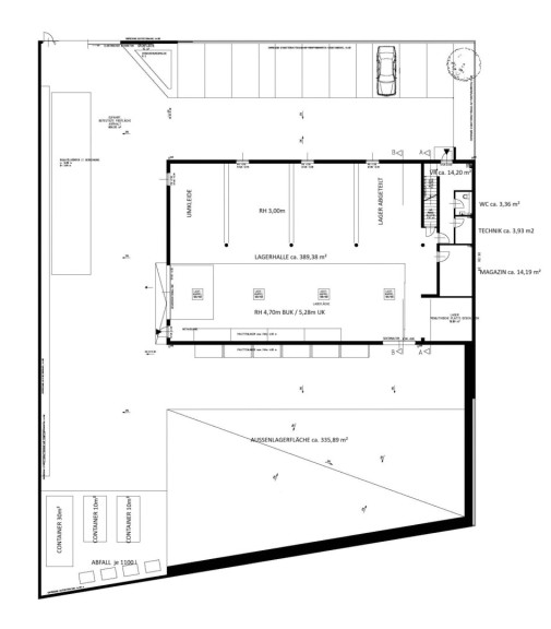 Außen stehen große Freilagerflächen mit befestigtem Untergrund zur Verfügung. Es sind 9 gekennzeichnete PKW-Stellplätze vorhanden. Die Liegenschaft ist vollständig eingefriedet und nahezu vollständig versiegelt.