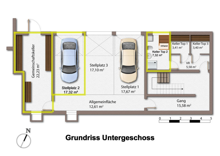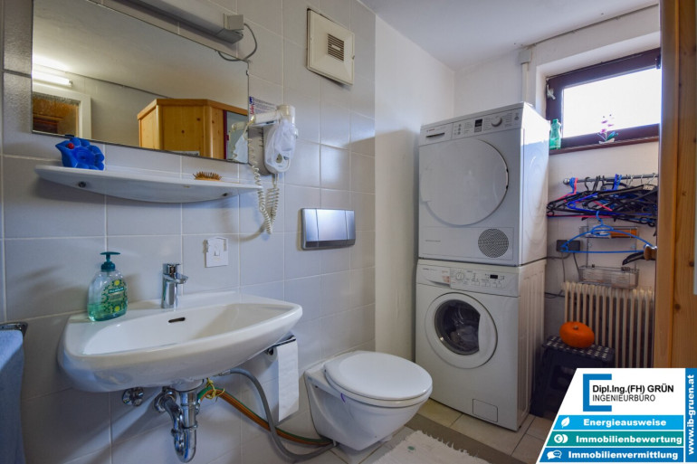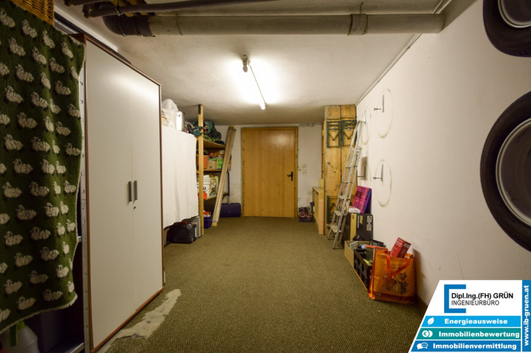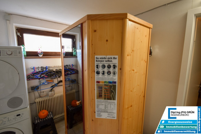 Ein weiterer großer Pluspunkt ist das Zubehör im Untergeschoss: Zur Wohnung gehört eine Garage bzw. ein Stellplatz, außerdem ein großer Gemeinschaftskeller sowie ein privates Kellerabteil. Besonders attraktiv ist dabei, dass sich im privaten Kellerbereich eine Infrarotkabine sowie ein kleiner Sanitärbereich mit Dusche, WC, Waschbecken und Waschmaschinenanschlüssen befinden – ein seltenes und sehr praktisches Extra.