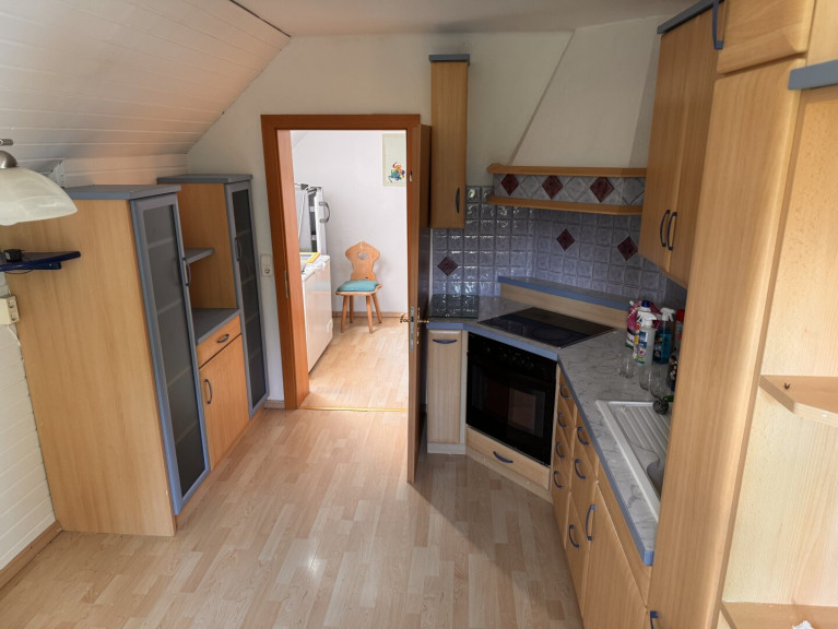 Die Wohnung im Obergeschoss verfügt über einen separaten Eingang, ca. 76 m² Wohnfläche und besteht aus einem Vorraum, einer Küche mit Essbereich, einem Wohnzimmer, zwei Schlafzimmern sowie einem Bad mit Waschgelegenheit, Dusche und WC.