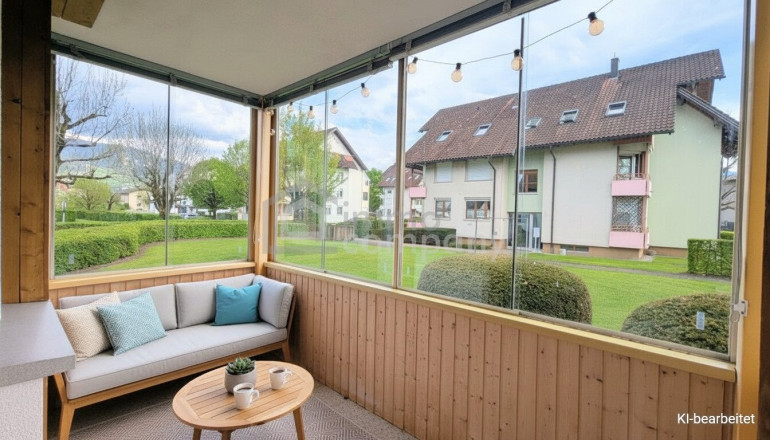 Vom großzügigen Wohnzimmer aus betreten Sie die ca. 5 m² große, nach Süden ausgerichtete Veranda (Loggia). Hier genießen Sie den ganzen Tag die Sonne und einen entspannenden Ausblick ins Grüne.