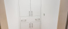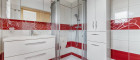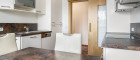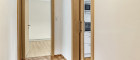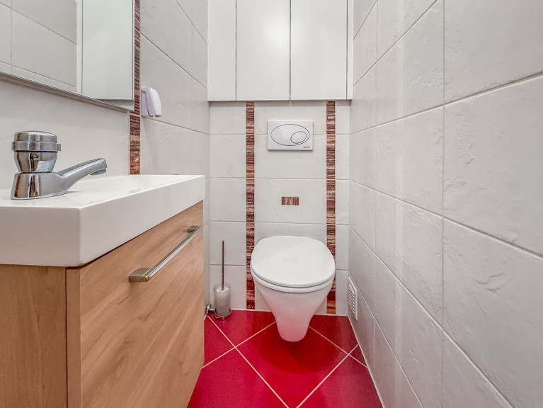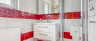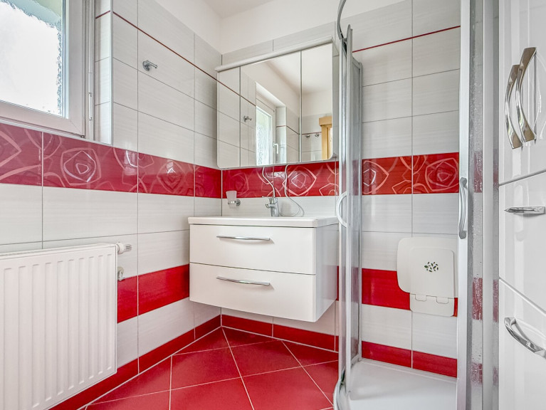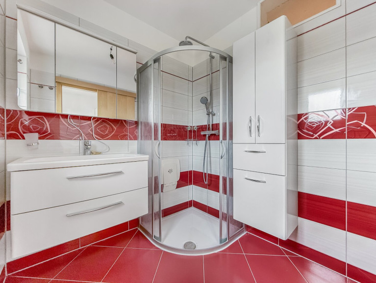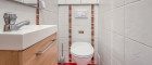 Das Badezimmer überzeugt mit einer bodenebenen Dusche sowie Anschlüssen für Waschmaschine und Wäschetrockner. Ein verglaster Durchbruch zum WC bringt zusätzlich Tageslicht in diesen Bereich und unterstreicht die durchdachte Gestaltung. Auch der Abstellraum wurde neu gestaltet und bietet praktischen Stauraum. Gleichzeitig beherbergt er den Warmwasserboiler, wodurch im Badezimmer wertvolle Fläche frei bleibt.
