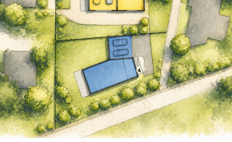 Das Grundstück ist Teil einer insgesamt doppelt so großen Parzelle und entspricht laut Bebauungsstudie dem Haus Blau. Gut möglich ist eine platzsparende, energieeffiziente und harmonische Einzelhausbebauung. Auf der kaufgegenständlichen Liegenschaft ist eine Wohnnutzfläche bis zu ca. 165 m² und großzügigen Außenbereichen möglich. Der Planungsvorschlag wurde von der Gemeinde bereits positiv beurteilt.