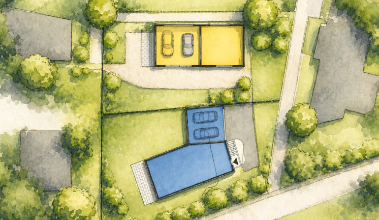 Das Grundstück ist Teil einer insgesamt doppelt so großen Parzelle und entspricht laut Bebauungsstudie dem Haus Gelb. Gut möglich ist eine platzsparende, energieeffiziente und harmonische Einzelhausbebauung. Auf der kaufgegenständlichen Liegenschaft ist eine Wohnnutzfläche bis zu ca. 165 m² und großzügigen Außenbereichen möglich. Der Planungsvorschlag wurde von der Gemeinde bereits positiv beurteilt.