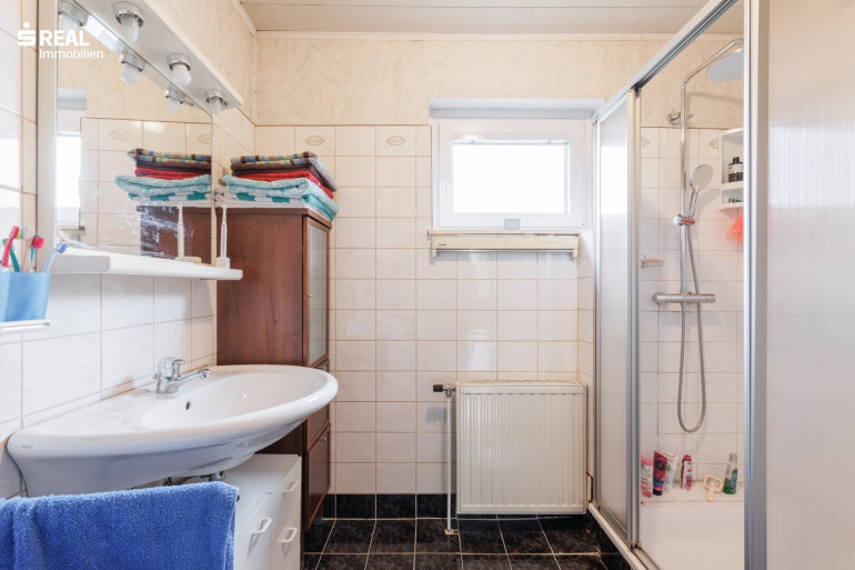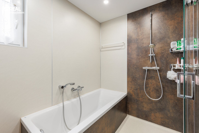 Fliesen, Parkett, Zentralheizung, Bad mit Fenster, Badewanne, Dusche, Garage, Parkplatz