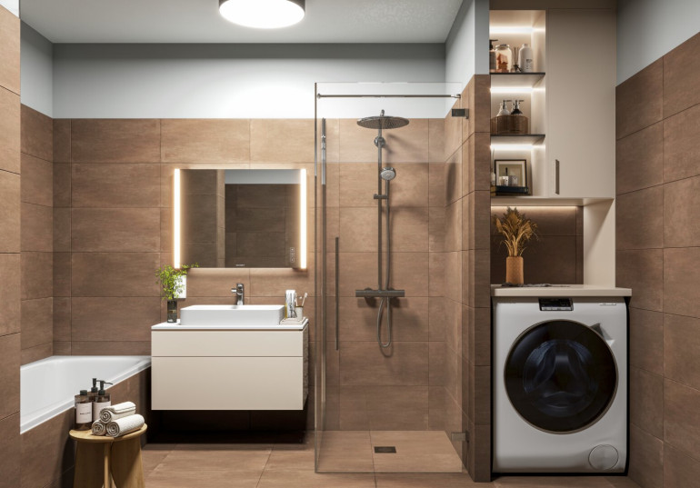 Feinsteinzeug-Fliesen im Format 60 x 30 cm werden auf den Wänden sämtlicher Bäder zargenhoch verlegt. Die Sanitärräume werden allesamt mit ausschließlich hochwertigen Markenprodukten, wie Laufen und Geberit, ausgestattet und laden zum Wohlfühlen ein.