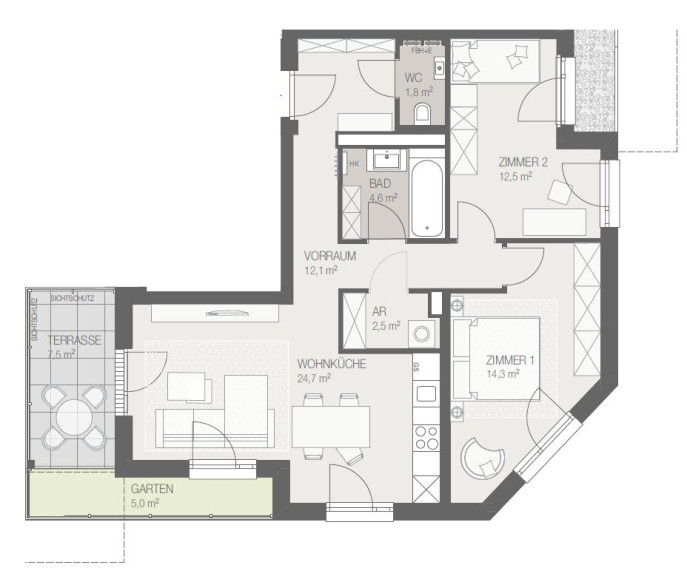 - 3–4 Zimmer-Wohnungen von 63-89 m² – alle mit großzügigen Freiflächen wie Terrassen oder Balkonen