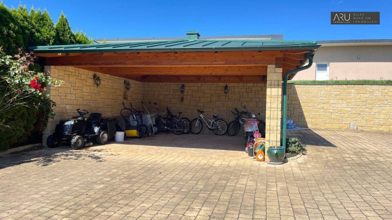 Auch für Ihre Fahrzeuge ist bestens gesorgt: Eine rund 30 m² große Garage bietet nicht nur Platz für einen Pkw, sondern auch zusätzlichen Stauraum für Fahrräder oder Gartengeräte. Ergänzend dazu steht ein Carport zur Verfügung.