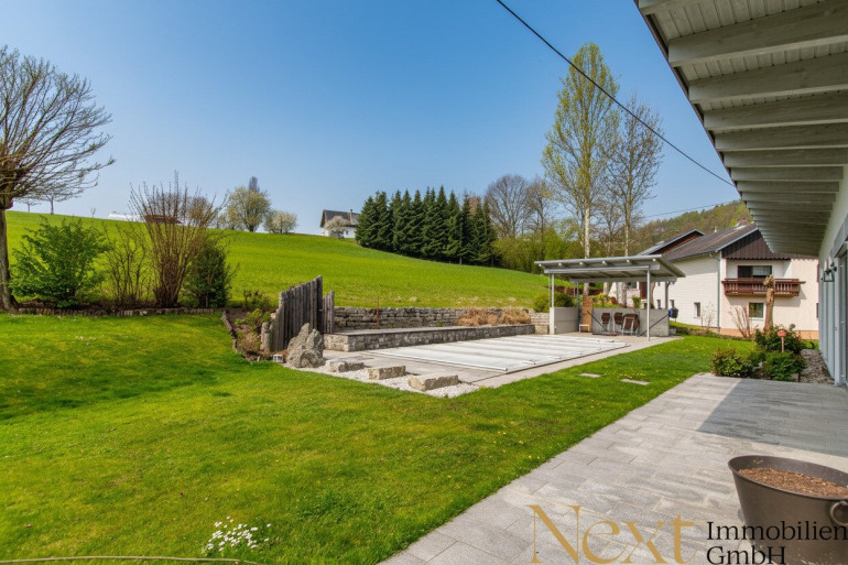 Der großzügige Garten wird schnell zum Lebensmittelpunkt: Ob entspannte Stunden am Pool, gesellige Abende im stilvoll überdachten Outdoor-Loungebereich oder einfach das Genießen der umliegenden Natur – hier entsteht Lebensqualität auf höchstem Niveau.