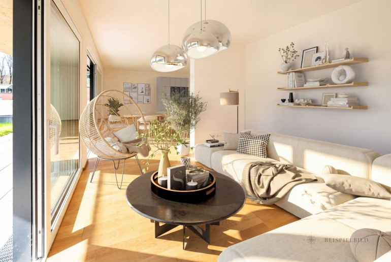 Der lichtdurchflutete Wohn- und Essbereich bildet das Herzstück der Wohnung und öffnet sich nahtlos zur Terrasse und in den Garten. Große Fensterflächen schaffen eine helle, freundliche Atmosphäre und verbinden Innen- und Außenraum auf besonders harmonische Weise.