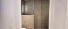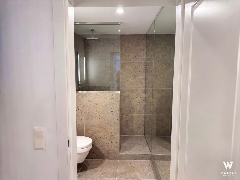 Modernes Badezimmer mit WC – ausgestattet mit Villeroy & Boch Sanitär, einer hochwertigen Dusche samt Regendusche sowie eleganter WOW-Verfliesung.