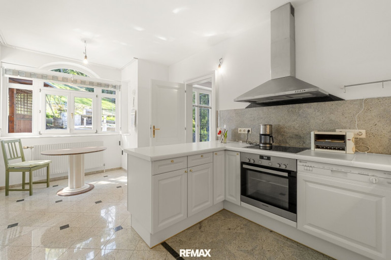 Steinboden, Parkett, Einbauküche, Personenaufzug, Bad mit Fenster, Garage, Alarmanlage