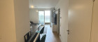 - Wohnraum mit offener Wohnküche (vollausgestattet) & Zugang zur Loggia mit Blick auf die Donau