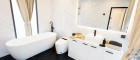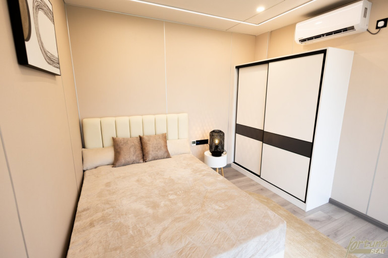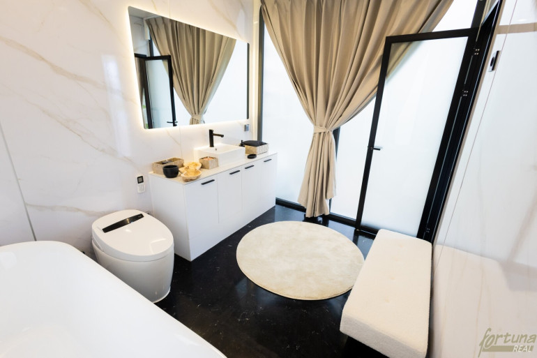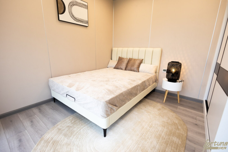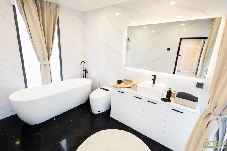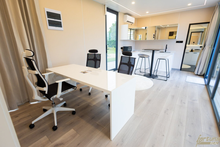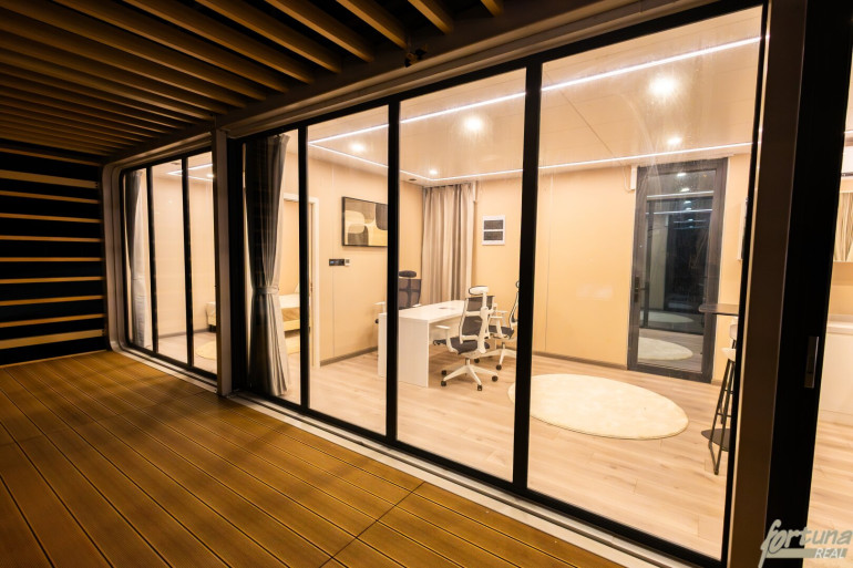 - Wohnen: Design-Sofa (auf Wunsch ausziehbar), integrierter Projektor, großer Esstisch, elektrische Vorhänge, großzügige Dachfenster