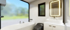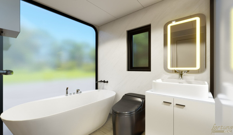 - Bad: Wahlweise Dusche oder Wanne, beheizbares WC, Waschtisch mit Unterschrank, großer Spiegel (optional Spiegel mit PC-/TV-Funktion)