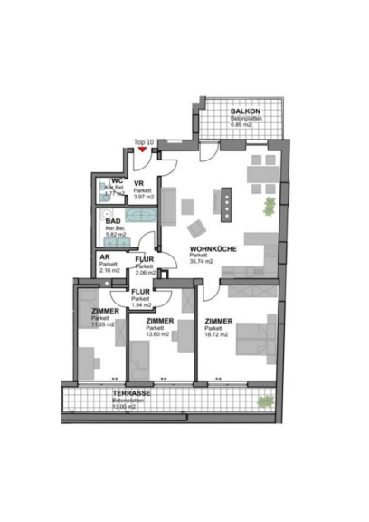 96,64 m² Wohnfläche + Balkon + Terrasse