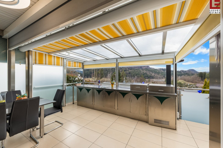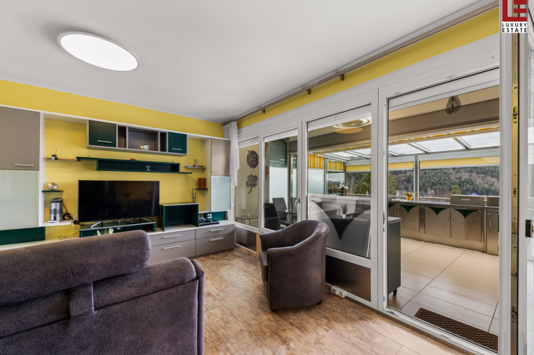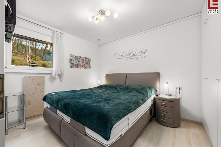 Die gut konzipierte Traum-Wohnung besteht aus einem großzügigen Wohn-Essbereich, der durch eine ca. 36 m² große, teils überdachte Terrasse mit einer perfekten Outdoor-Küche, Grillplatz und Außendusche nach Süden erweitert wird. Der pflegeleichte Steingarten mit Traumkulisse hat eine eigene, zusätzliche 9 m² Terrasse mit Stiege. Die Innen-Küche mit Ess- und Wohnbereich und das Bad mit WC sind neu- und hochwertig eingerichtet. Das nach Norden gerichtete Schlafzimmer ist ruhig und geräumig. Davor gibt es noch eine speziell angelegte, erweiterte, eigene Naturstein-Terrasse für heiße Tage. Geheizt wird die gut isolierte und gewartete Immobilie mit einem Pelletofen oder günstig mit der eigenen Photovoltaikanlage und hochwertigen Marmor-Infrarot-Heizplatten, die wie die TV-Anlage, die Ü-Kameras und die Alarmanlage über das Internet steuerbar sind. Ein Glasfaseranschluss ist demnächst erwerbbar. An der privaten Zufahrstraße am Waldrand befindet sich im Westen das eigene Carport mit zusätzlicher Lagermöglichkeit und extra Gästeparkplätze.
