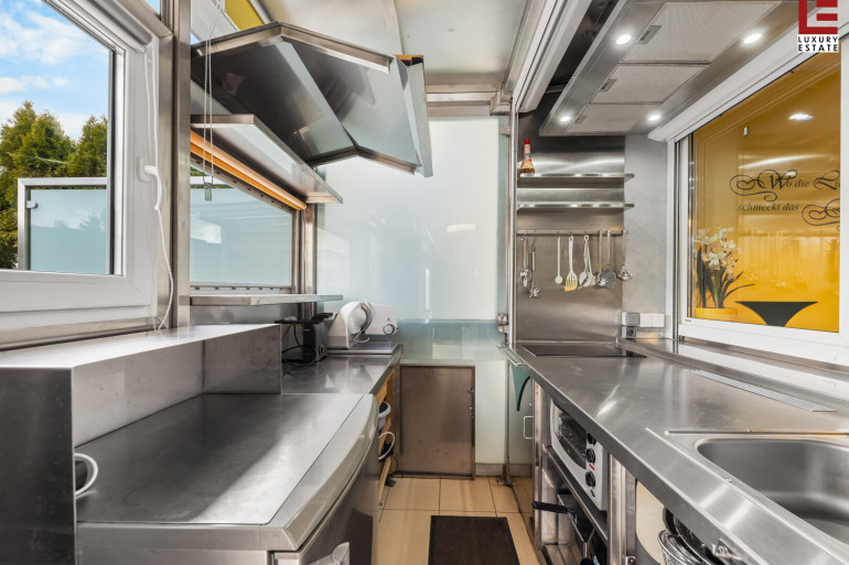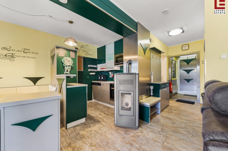Parkett, Fliesen, Steinboden, Elektro, Heizofen, Einbauküche, Wohnküche / offene Küche, Nordbalkon, Südbalkon, Bad mit Fenster, Dusche, DV-Verkabelung, Kabel/Satelliten-TV, Carport, Alarmanlage, Rampe, Sicherheitskamera