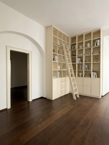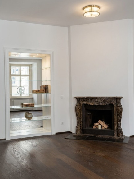 Wohnkultur pur: Ein architektonisches Highlight ist die elegante Bibliothek im Flurbereich, die zum Verweilen einlädt. Das Herzstück der Wohnung bildet das weitläufige Wohnzimmer, in dem ein offener Kamin an kühlen Abenden für eine behagliche Atmosphäre sorgt.