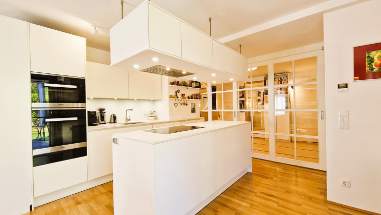 Vom großzügigen Vorzimmer mit verglaster Schiebetür gelangt man in die stilvolle Küche mit Kochinsel und Essbereich sowie in den privaten Masterbereich mit Bad en suite und begehbarem Kleiderschrank. Das helle Wohnzimmer bietet direkten Zugang zur Südterrasse. Ein weiteres Badezimmer und ein Hauswirtschaftsraum ergänzen das komfortable Raumangebot.