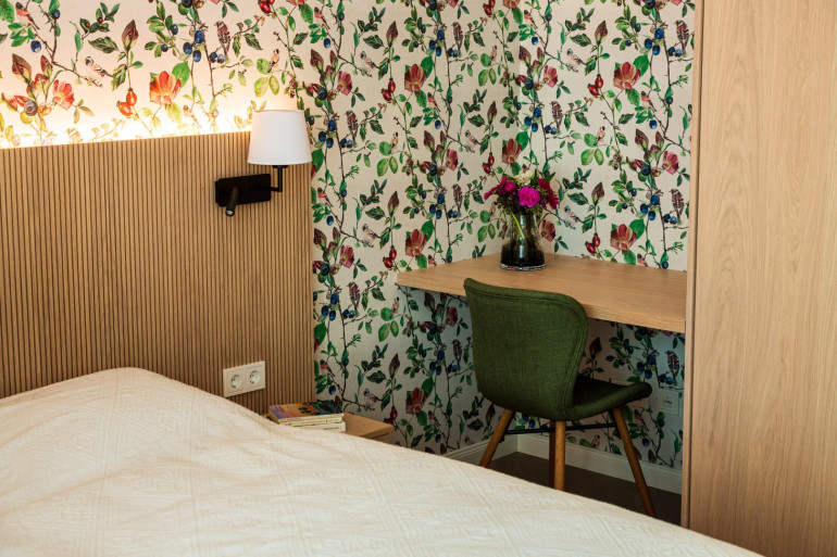 The specific unit on offer, “Suite 01”, provides approximately 34 m² of living space as well as a terrace of around 6 m² with private access. The layout is efficiently designed. The entrance area seamlessly connects the fully equipped kitchenette with the living and sleeping space. High-quality box-spring beds, a well-designed workspace and plenty of natural light ensure a high level of comfort.