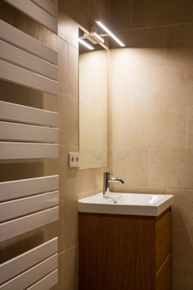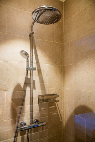 Das Badezimmer ist modern ausgeführt und verfügt über eine großzügige Regendusche. Elektrische Außenjalousien sowie eine energieeffiziente Versorgung über Wärmepumpe und Photovoltaik ergänzen die Ausstattung.