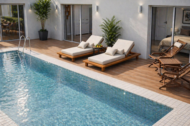 - Der südseitig ausgerichtete Pool ist direkt von allen südseitigen Zimmern zugänglich.