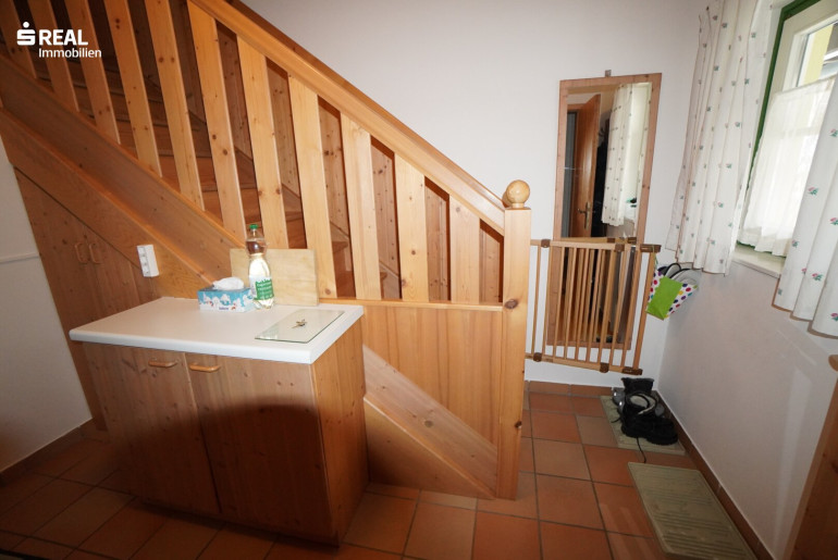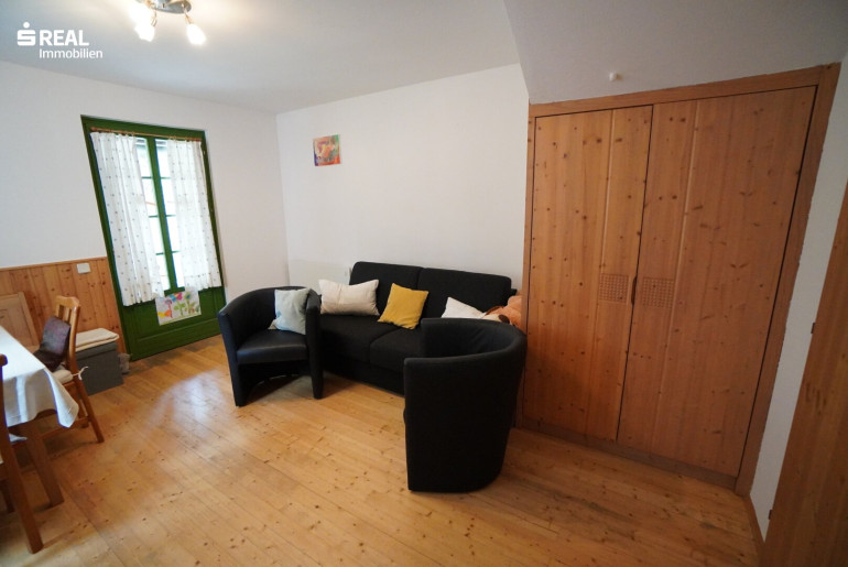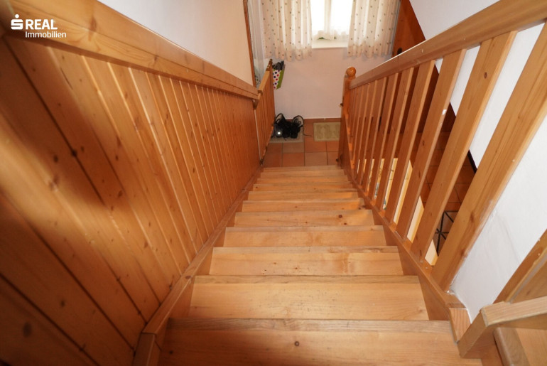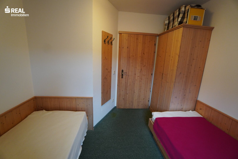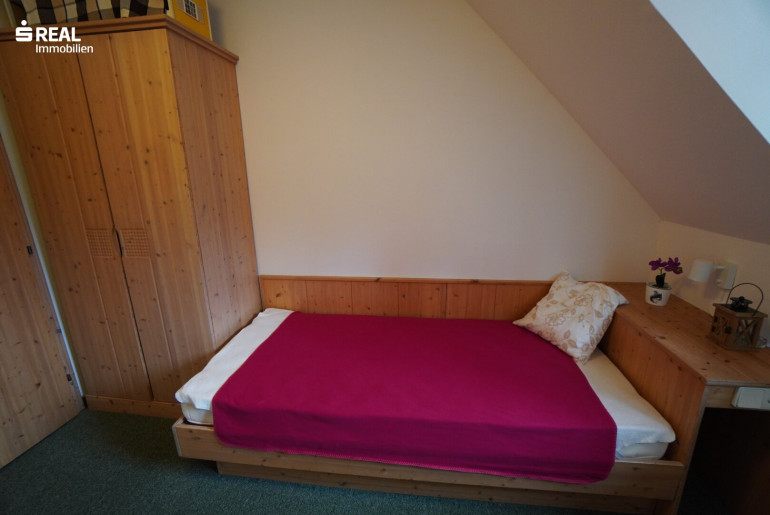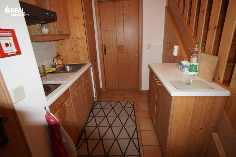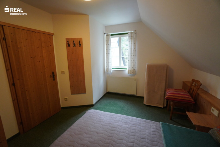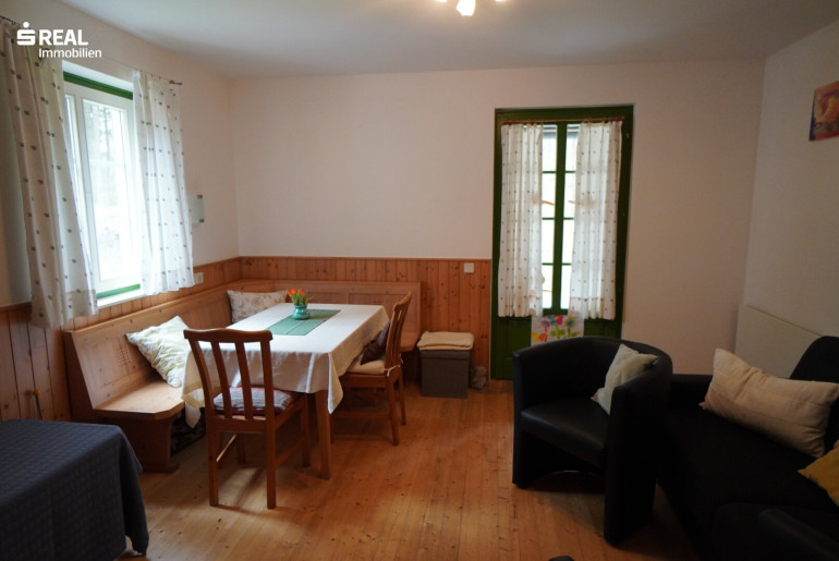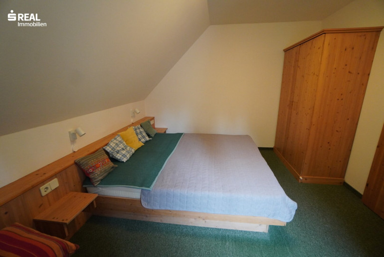 Die Wohnung ist komplett im Landhausstil (Holz) möbliert. Die Nutzfläche beträgt rd. 58 m² und teilt sich in zwei Etagen auf. Im Erdgeschoß findet man den Windfang/Vorraum, ein WC mit Handwaschbecken, eine Küchenzeile mit Herd, Spülbecken und Kühlschrank, einer Treppennische und einem geräumigen Wohnzimmer mit Essecke, Sitzgarnitur und den Ausgang zur Terrasse in absoluter Ruhelage. Über eine Holztreppe gelangt man ins Dachgeschoß, wo man den Vorraum, zwei Zimmer und das Badezimmer mit WC und Dusche findet. Ein separates Kellerabteil steht ebenfalls zur Verfügung.