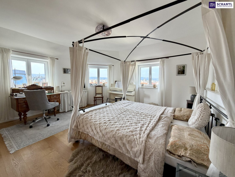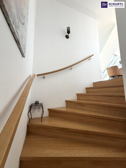 Das absolute Herzstück der Wohnung befindet sich im oberen Geschoss – ein beeindruckender, über 40 m² großer Wohn-, Ess- und Kochbereich mit herrlichem Weitblick Richtung Westen bis zum Kahlenberg. Große Dachflächenfenster durchfluten den Raum mit Licht, ein ausklappbares Balkonfenster sorgt für ein ganz besonderes Wohngefühl.