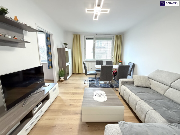 Ein großzügiger Wohnbereich mit angeschlossener Küche bildet das Herzstück der Wohnung. Zwei separate Schlafzimmer bieten ausreichend Platz für Familie, Homeoffice oder Gäste. Das Badezimmer ist mit einer Badewanne ausgestattet, das WC ist getrennt. Ergänzt wird das Raumangebot durch einen praktischen Abstellraum.