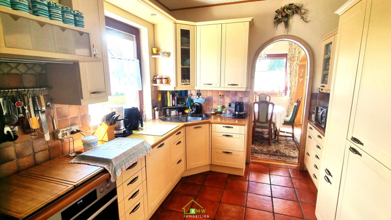 Die moderne Einbauküche lädt zum gemeinsamen Kochen und Genießen ein und grenzt direkt an den großzügigen Wohnbereich mit Zugang zur überdachten Terrasse (ca. 40m²). Hier können Sie entspannte Stunden im Freien verbringen, während der gepflegte Garten zusätzlichen Platz für Erholung, Spiel und Freizeitaktivitäten bietet. Die Garage rundet das Angebot ab und schützt Ihre Fahrzeuge zuverlässig vor Witterungseinflüssen.