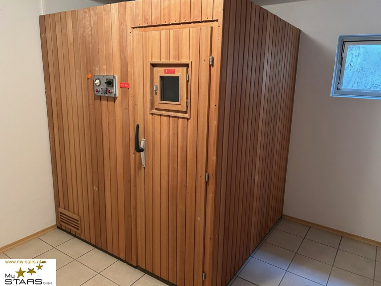 Parkett, Fliesen, Fernwärme, Fußbodenheizung, Kamin, Zentralheizung, Einbauküche, Bad mit Fenster, Badewanne, Dusche, Garage, Parkplatz, Sauna, Swimmingpool