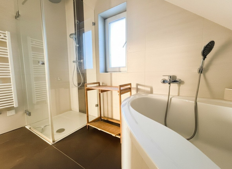 - Helles Badezimmer mit Tageslicht, Dusche und Eckbadewanne