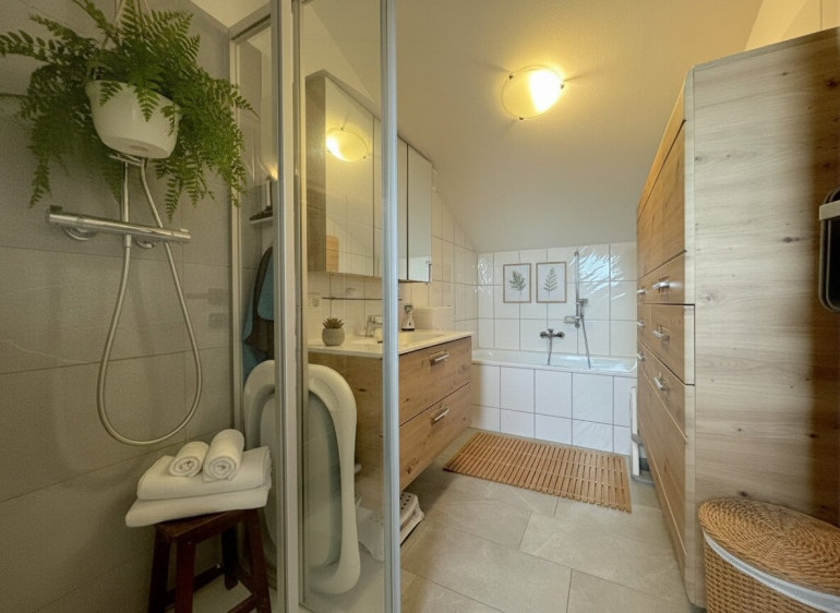 Im Obergeschoss der Wohnung befinden sich zwei Schlafzimmer, das Badezimmer mit Badewanne und Dusche, die Küche sowie der Essbereich.