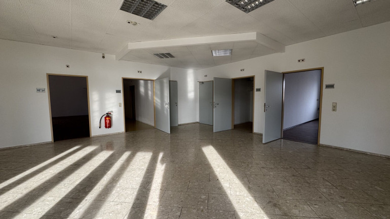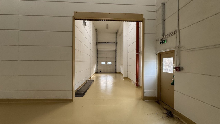Drei ebenerdige Hallentore — jeweils LKW-befahrbar, Direkteinfahrt in die Halle. Die Raumhöhe von 6,35 m erlaubt den Betrieb von Hochregalsystemen und größeren Maschinen. Sämtliche Bereiche sind zentral begehbar und miteinander verbunden. 15 PKW-Stellplätze auf dem Gelände.