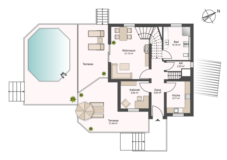 - Große, teils überdachte Terrasse & Pool