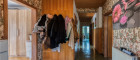 Hauseingang zum offenen Vorraum mit Garderobe und Auszugtreppe zum Dachboden.