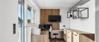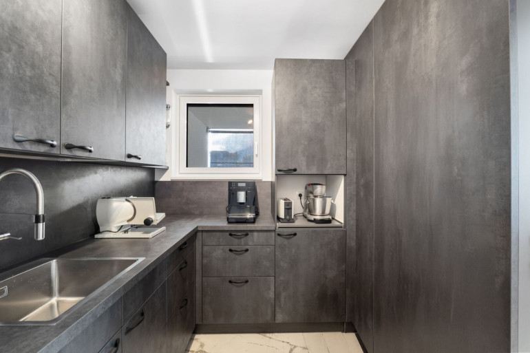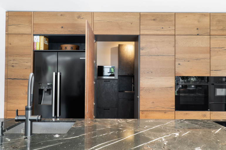 Ein besonderes Highlight ist die raffiniert integrierte, begehbare Zusatzküche, die sich geschickt hinter der eigentlichen Küche verbirgt und idealen Raum für die Zubereitung von Speisen bietet.