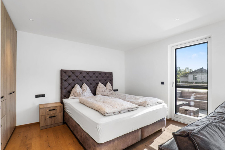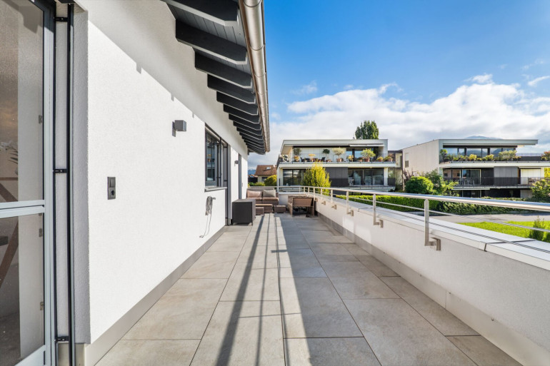 Die großzügige Terrasse sowie ein Balkon bieten zusätzlichen Raum für Erholung und gesellige Momente im Freien.