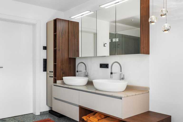Abgerundet wird dieses attraktive Angebot durch eine geräumige Doppelgarage mit über 40 m² Fläche, exklusive Einbaumöbel, zwei hochwertige Einbauküchen sowie einen großzügigen Dachboden, der wertvollen Stauraum schafft.