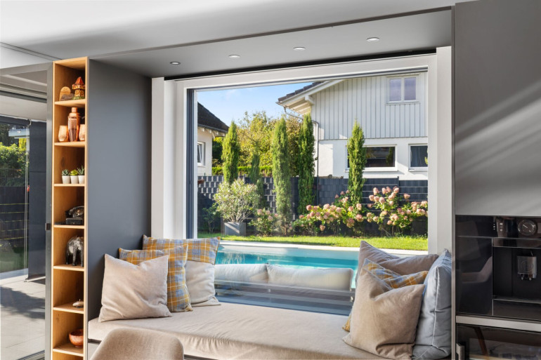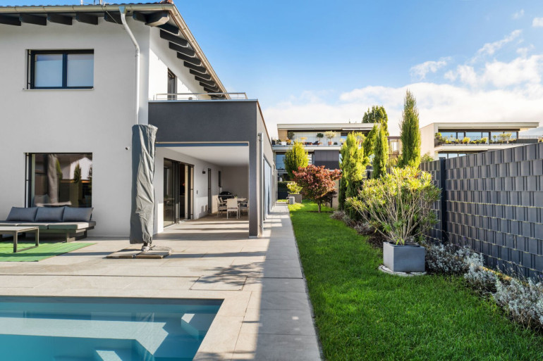 Der hochwertig gestaltete Außenbereich mit eigenem Swimmingpool schafft eine private Wohlfühloase und lädt zu entspannten Stunden sowie sommerlichem Urlaubsgefühl direkt zuhause ein.